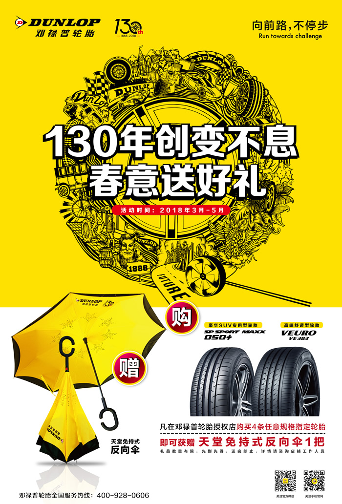 值此130周年慶典之際,為了回饋廣大車主對鄧祿普的厚愛與支持,鄧祿普將在全國范圍內(nèi)推出“春意送好禮”促銷活動:2018年3月至5月,消費者前往鄧祿普指定門店購買4條SP SPORT MAXX 050+或VEURO VE303輪胎,即可獲贈印有紀念LOGO的定制版天堂免持式反向傘,無論風(fēng)雨,鄧祿普都將與車主一路相伴。